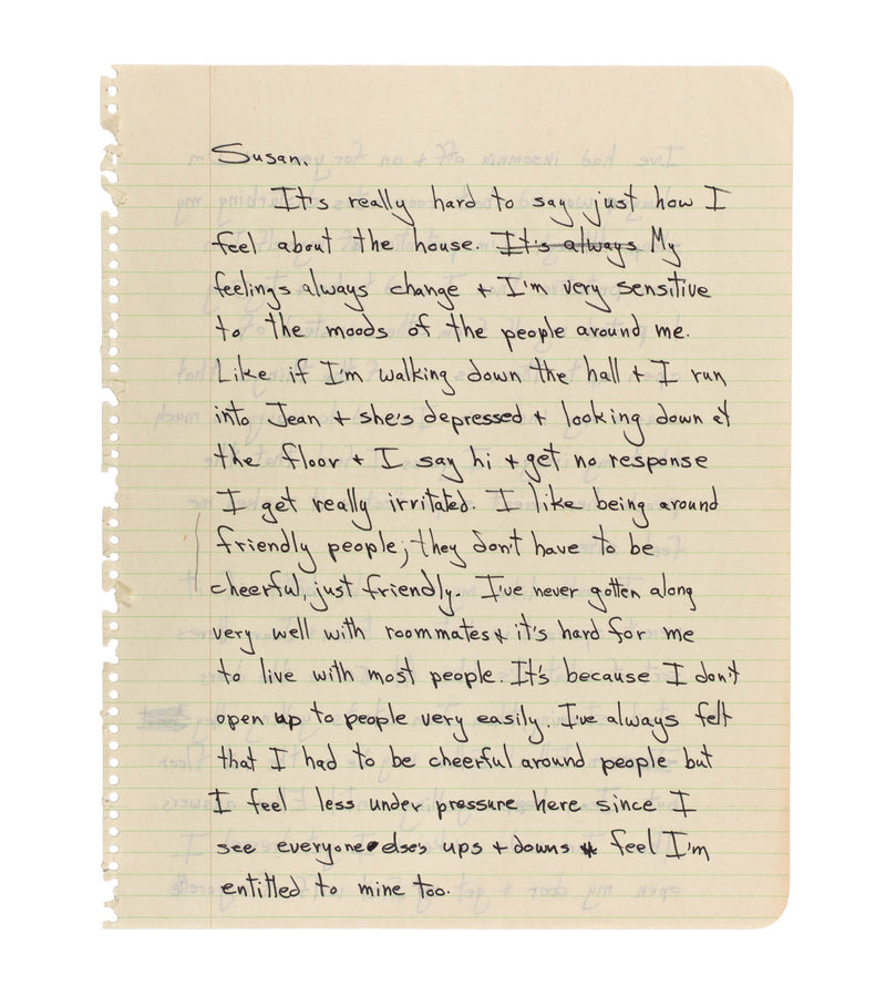 Boarding houses like 44 Irving Street were transitional spaces, yet Meiselas found individuality and self-expression in each room. Her portraits—full of personal detail and visual texture—reveal a rich inner life often hidden in shared housing. The handwritten letters act as a kind of written punctum, a counterpoint to the image that pierces the surface with honesty and introspection.