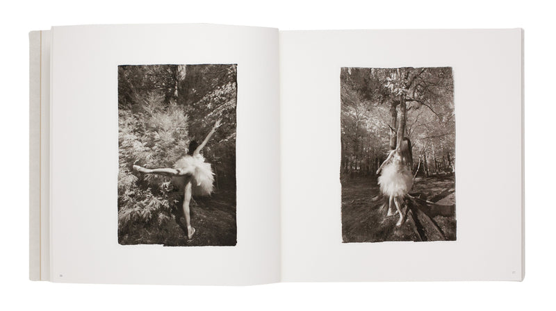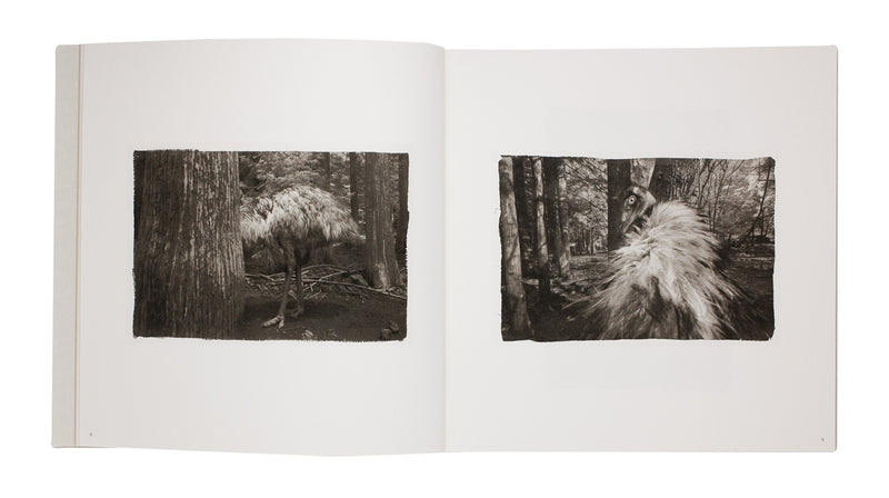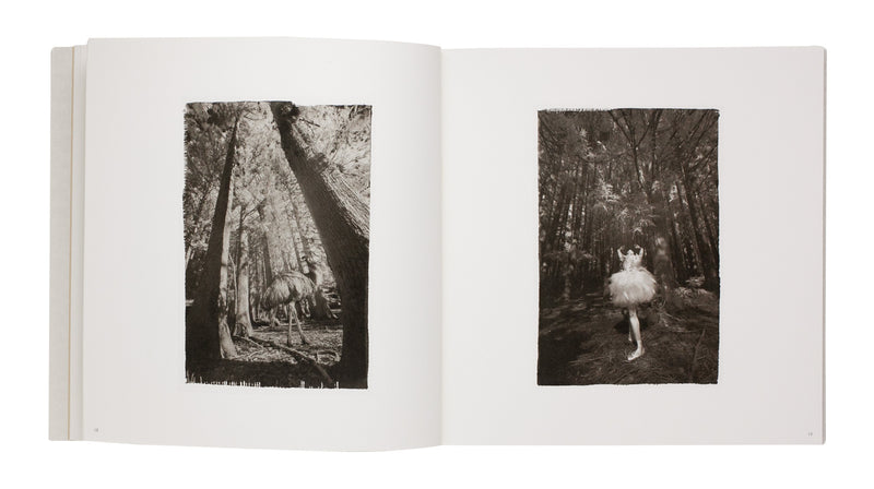 Working with the traditional platinum–palladium printing process and high-quality Japanese washi paper, Hisako Sakurai created “Adagio Dans La Forêt,” a series of photographs that fluctuate between reality and dreamworld. Set in a dense yet luminous forest, the work centers on a group of emus – birds with “grotesque eyes,” straight from the “age of dinosaurs,” as Sakurai writes in her afterword – photographed in an exploration of their strange, compelling elegance. At one point, a ballet dancer enters the scene, at first barely noticeable; through her poses and dress, she blends almost seamlessly with the emus. As the series unfolds, dancer and birds engage in a quiet dialogue, conveyed entirely through gesture.