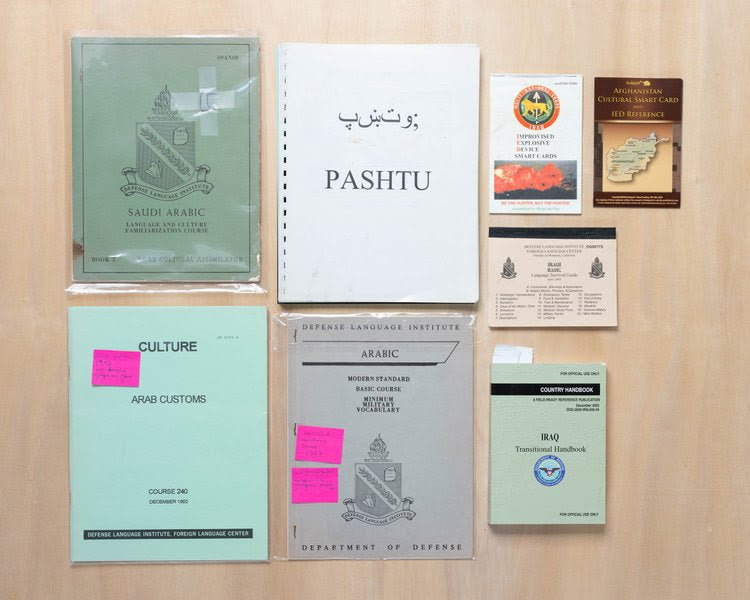 Printed materials such as fold-out pocket guides used by American soldiers and Marines deployed to Iraq and Afghanistan and language training workbooks for Americans with ties to the military are combined with the photographs. These materials were created either by the US military, related branches of the government or military contractors. Beckett purchased a majority of this literature from ebay by searching for keywords related to American military involvement in the wars in Iraq and Afghanistan. Although many of the materials are contemporary to the time of the project, some are historic and date back to the 1960s and 1970s, revealing the longstanding nature of American biases relating to Arab and Muslim people.