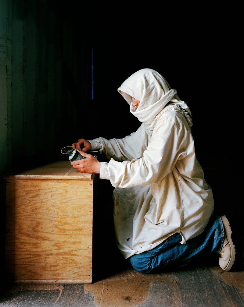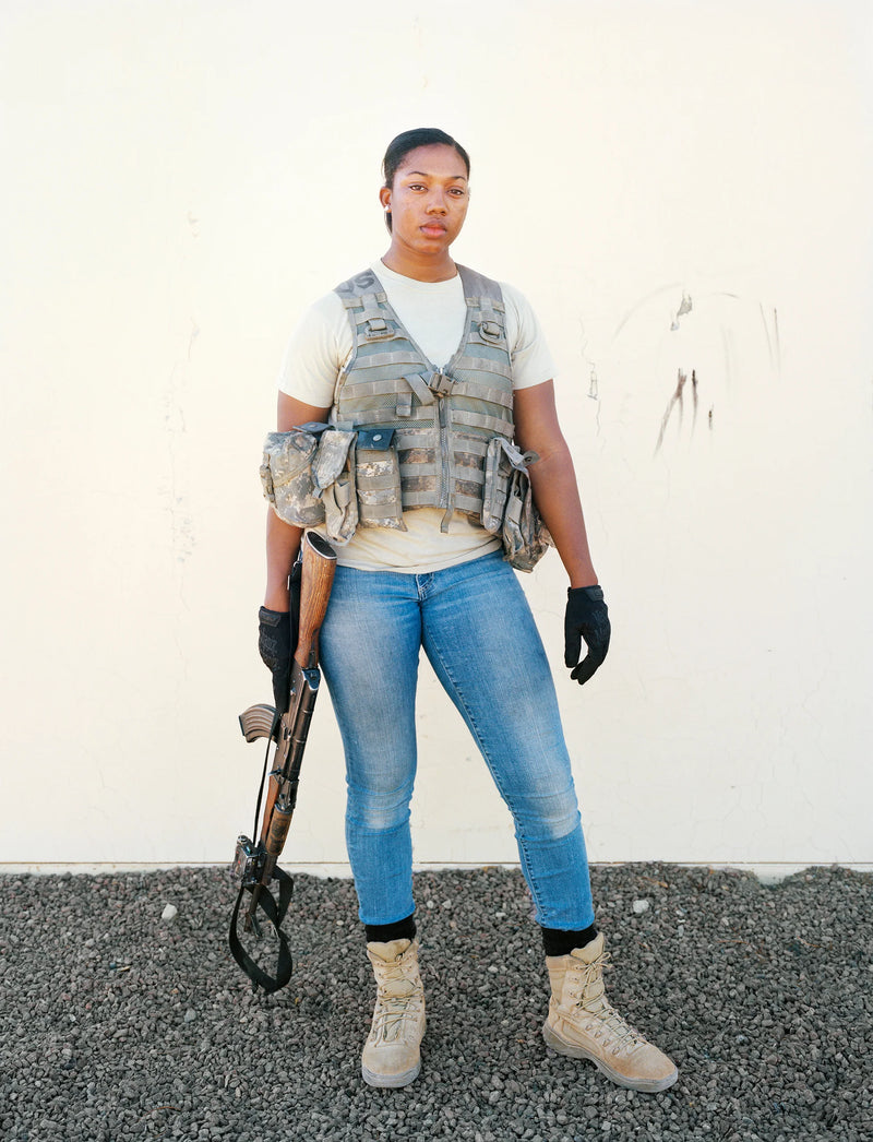 Those portrayed in the photographs include military personnel—often combat veterans playing the role of enemy combatants—immigrants from Iraq or Afghanistan intended to make the training look and feel realistic, and local American civilians hired to populate the artificial villages. The photographs include a combination of formal portraits, landscapes depicting makeshift constructed buildings, and more informal images of the figures interacting within the training scenarios. The photographs were made at Fort Drum, New York; Fort Irwin, California; Fort Jackson, South Carolina; Fort Polk, Louisiana; The Marine Corps Air Ground Combat Center (Twentynine Palms), California; and The Marine Corps Mountain Warfare Training Center, California.