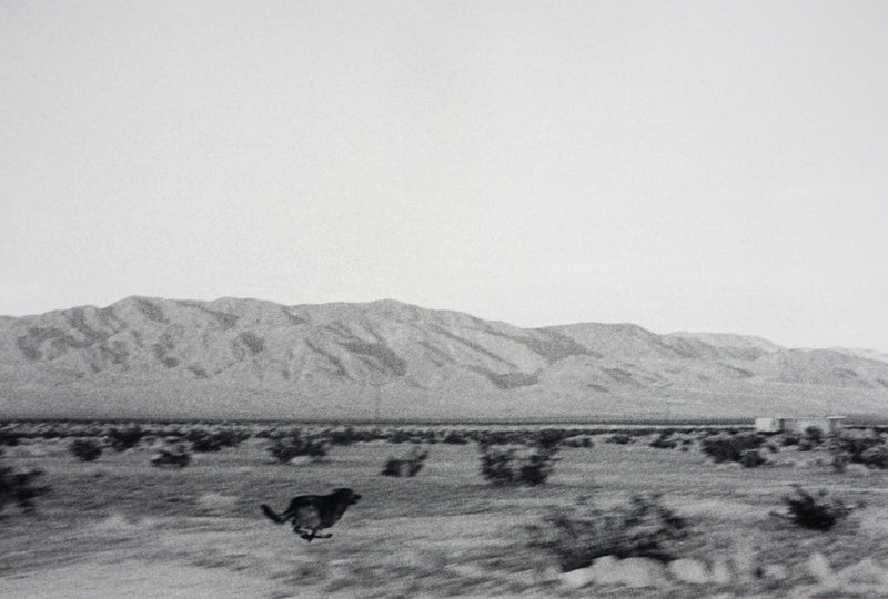 “From 1995 to 1998, I worked on a series of photographs of isolated houses in the desert at the east-end of the Morongo Valley in Southern California. As I meandered through the desert, a dog would occasionally chase my car. Sometime in 1996 I began to bring along a 35mm camera equipped with a motor drive and loaded with a fast and grainy black-and-white film. The process was simple; when I saw a dog coming toward the car I would pre-focus the camera and set the exposure. With one hand on the steering wheel, I would hold the camera out the window and expose anywhere from a few frames to a complete roll of film. I'll admit that I was not above turning around and taking a second pass in front of a house with an enthusiastic dog. Contemplating a dog chasing a car invites any number of metaphors and juxtapositions: culture and nature, the domestic and the wild, love and hate, joy and fear, the heroic and the idiotic. It could be viewed as a visceral and kinetic dance. Here we have two vectors and velocities, that of a dog and that of a car and, seeing that a camera will never capture reality and that a dog will never catch a car, evidence of devotion to a hopeless enterprise.” – John Divola